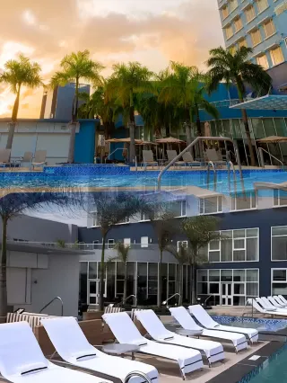 현대적인 호텔 수영장과 아름다운 일몰의 조화.