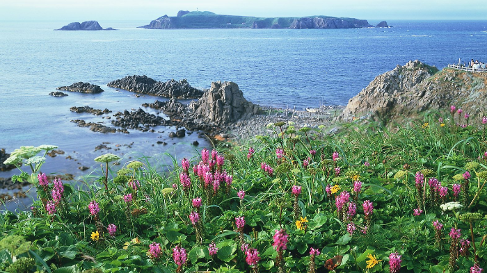사진에서는 섬의 해안선과 함께 보이는 야생화들이 여행자들에게 자연의 아름다움을 선사합니다.